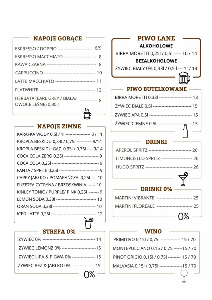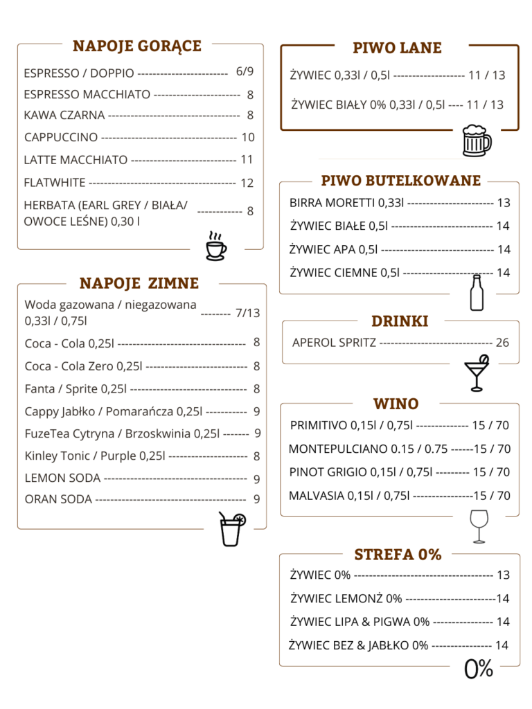 Na grafice z napojami zobaczysz dostępne opcje – od napojów gazowanych i niegazowanych, przez wodę, aż po wybory, które świetnie współgrają z aromatycznym sosem pomidorowym, ciągnącą się mozzarellą i chrupiącymi brzegami prosto z pieca. Jeśli lubisz ostre smaki, postaw na coś mocno orzeźwiającego. Do delikatniejszych pizz świetnie sprawdzą się lżejsze, neutralne napoje, które nie przykryją smaku składników.
